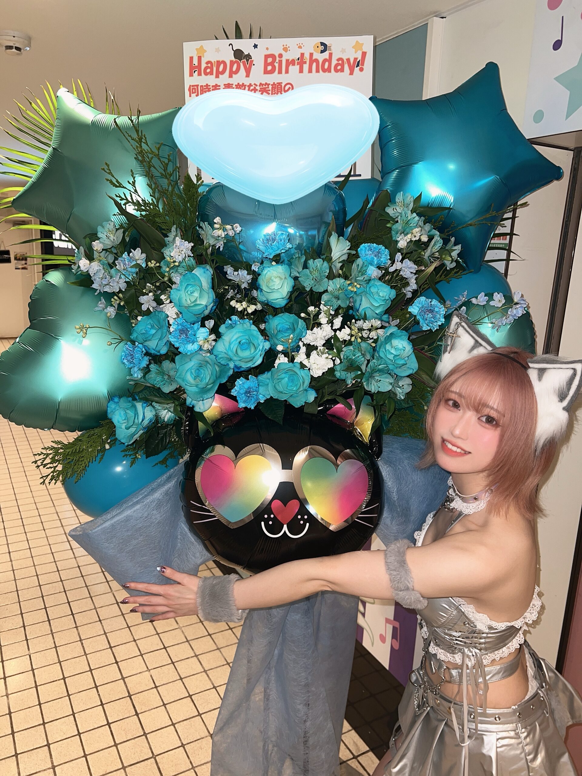 お花もバルーンもちゃんと私の好きなターコイズブルーで、猫ちゃんまでいて…🐈⬛🩵